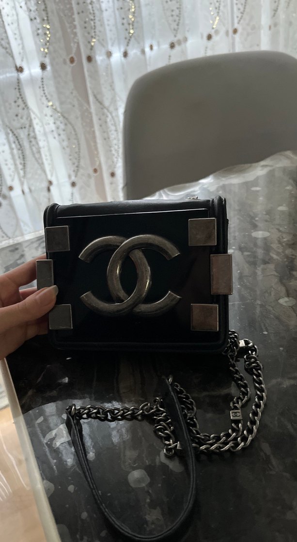Siyah hakiki deri çanta, Chanel detay ve baskılı desenle şık bir görünüm sunar. Zincir askısı Paris tarzını yansıtır.