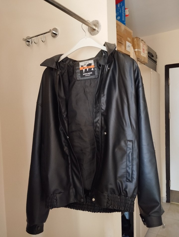 Siyah deri, uzun kollu ceket. Bol kesim ve lastikli bel detayına sahip, rahat ve şık bir günlük dış giyim ürünü.Ürün sıfır ayarında herhangi bir yerine bir kusuru yoktur.