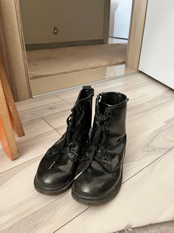 Siyah deri, stiletto topuklu, tokalı ve bağcıklı detaylara sahip botlar, günlük kullanım için uygundur.