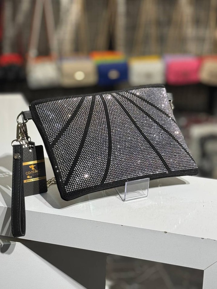 Siyah deri, payet detaylı ve baskılı modern tasarıma sahip kadın el çantası, şık ve göz alıcı bir görünüm sunar.
