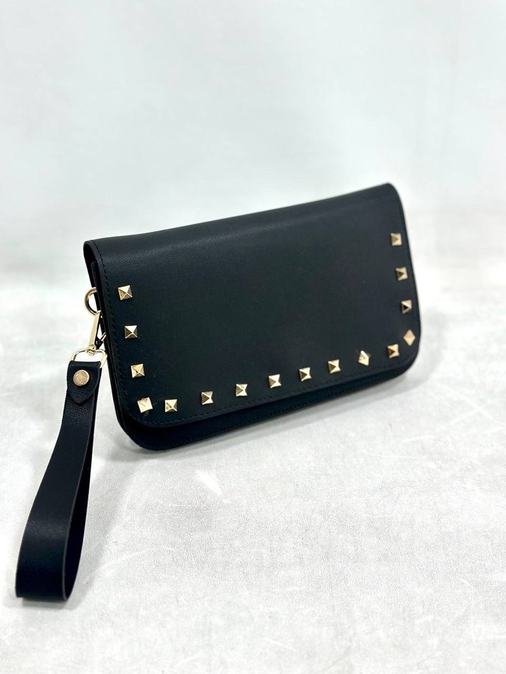 Siyah deri ve altın perçin detaylı, bilek kayışlı clutch çanta. Minimalist rock punk tarzında, günlük kullanıma uygun.