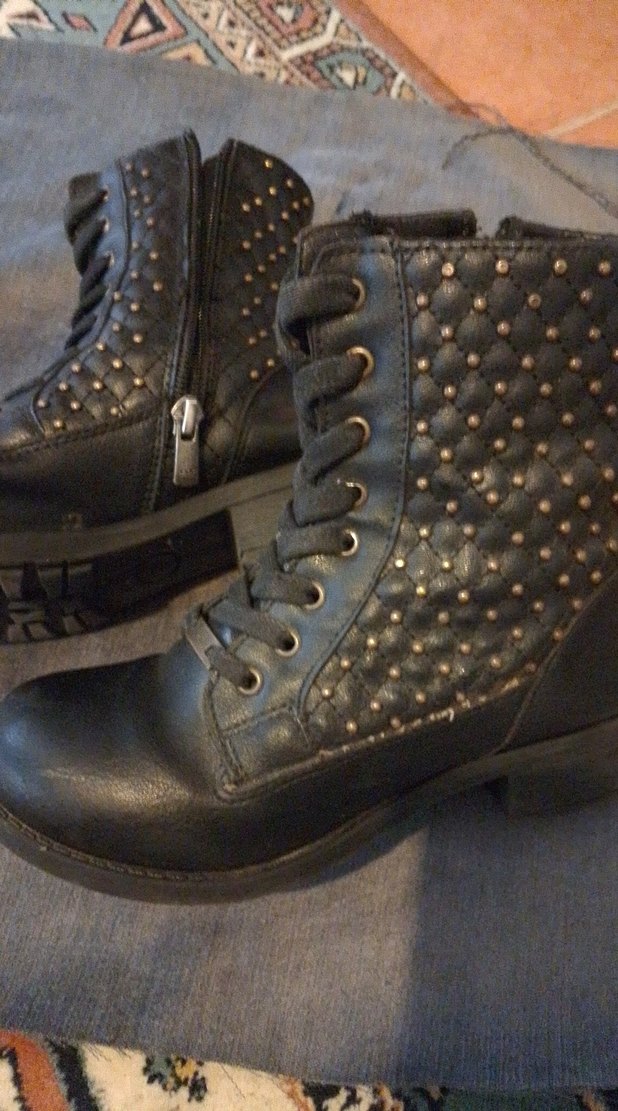 Siyah deri botlar, perçinli desenli ve tokalı detaylarla, günlük kullanıma uygun rock punk tarzında. 33 numara