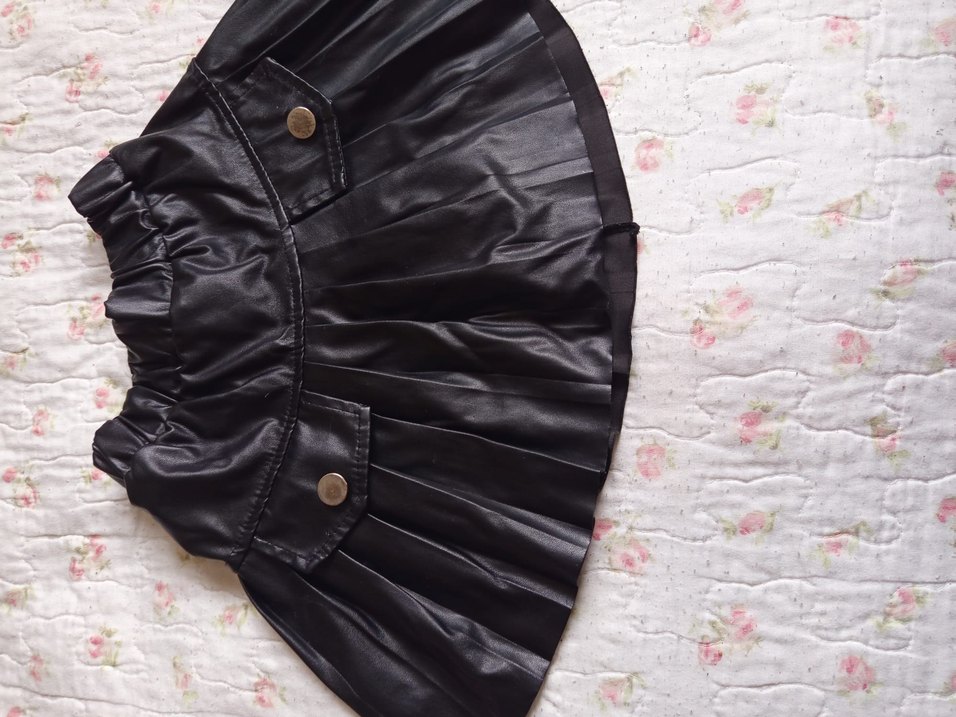 Siyah deri pileli mini etek, gotik tarzda ve rock punk havasında. Fitted kesimi ve midi boyu ile dikkat çekiyor.