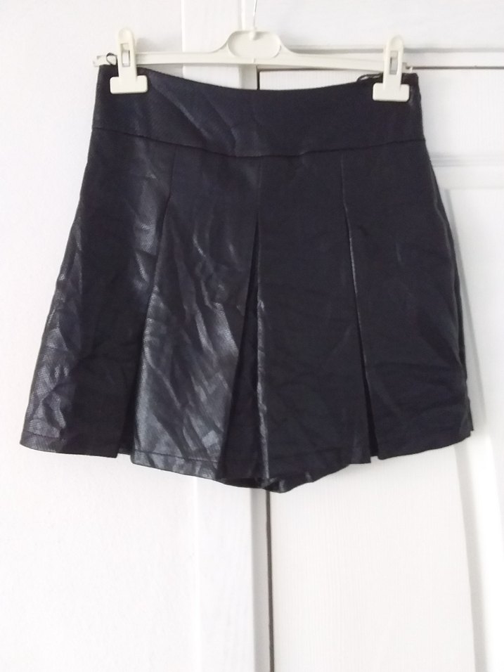 Siyah deri, pileli ve dar kesim mini etek. Gotik tarzı için uygun. deri etek, mini etek, şort etek, şortlu etek, önden etek arkadan şort görünümlü, deri, içi yünlü, L beden
