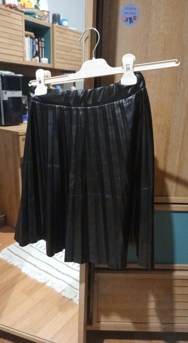 Siyah deri pilili midi etek, bol kesim. Gotik tarzda, günlük kullanıma uygun.