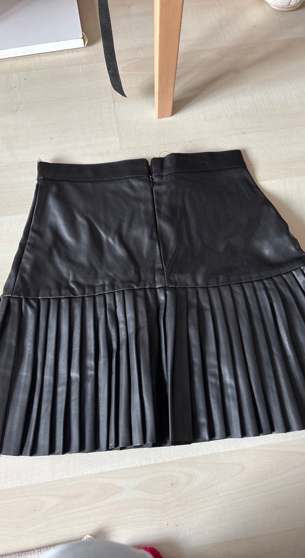 Siyah deri, pilili detaylı ve vücuda oturan mini etek. Gotik ve avangart tarzı yansıtır. Moda tutkunları için ideal.