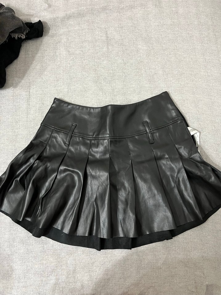 Pilili, siyah deri mini etek, gotik ve avangart tarz için uygun. Günlük kullanımda şık ve dar kesim bir model.