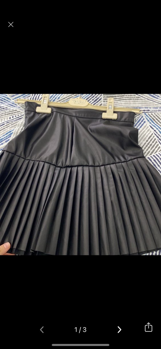 Siyah deri pilili mini etek, dar kesim bel ile modaya uygun gotik tarz. Kısa boyuyla trend bir görünüm sunar.