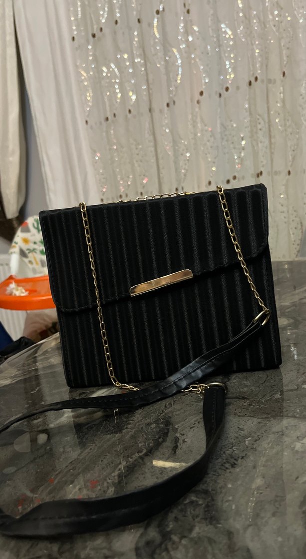 Siyah deri, pilili ve çizgili desenli bu Parisian tarz çanta, zincir askılı ve günlük sokak modasına uygun.