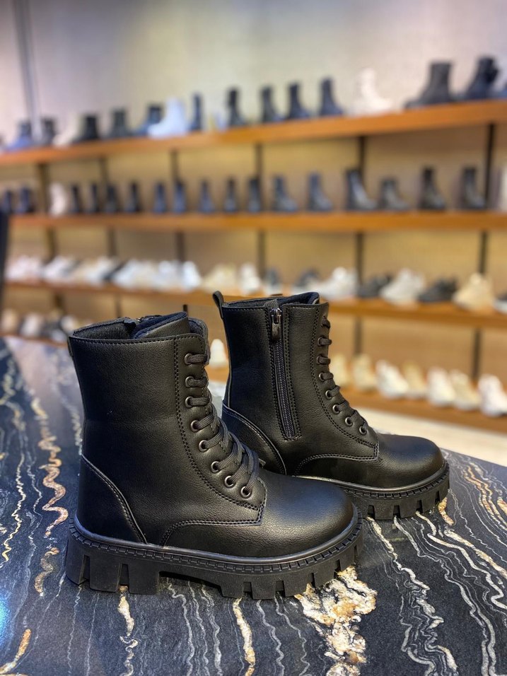 Siyah deri, platform topuklu ve bağcıklı botlar, koyu leopar desenlidir. Günlük sokak tarzı için uygundur, rock punk havası taşır.