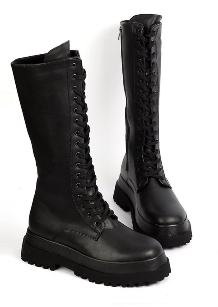 Siyah Deri Platform Topuklu Bağcıklı Gotik Çizme