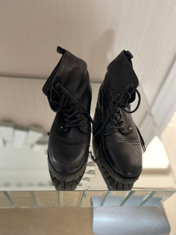 Siyah deri platform topuklu kadın botları, bağcıklı ve tokalı detaylarla. Gotik tarzda, günlük kullanım için uygun grunge punk havası taşıyor.