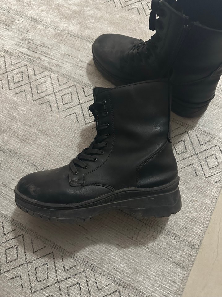 Siyah deri, tokalı ve platform topuklu botlar, günlük kullanıma uygun bir sorunu yoktur.