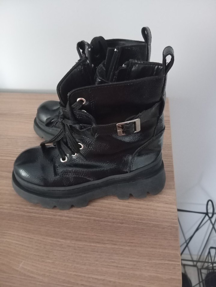 Siyah deri, tokalı ve platform topuklu gotik stile sahip botlar. Trend sokak modasına uygun, desen içermeyen sağlam tasarım.