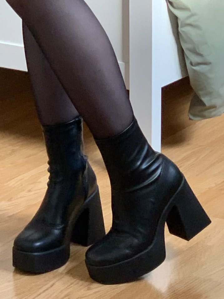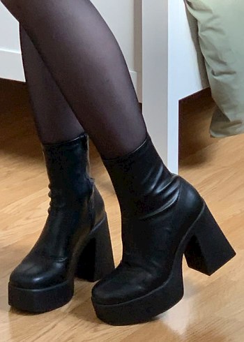 1 ay önce aldım. çok kullanmadım topuklu kullanmadığım için satılık. Siyah deri, kareli desenli ve tokalı platform topuklu botlar. Cesur gotik tarzı, romantik akşamlar için uygundur.