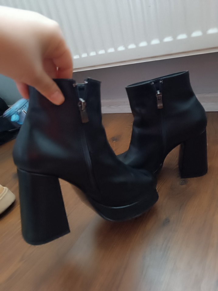 Siyah deri, tok platform topuklu, tokalı gotik tarzda kadın bot, günlük kullanım için uygun.