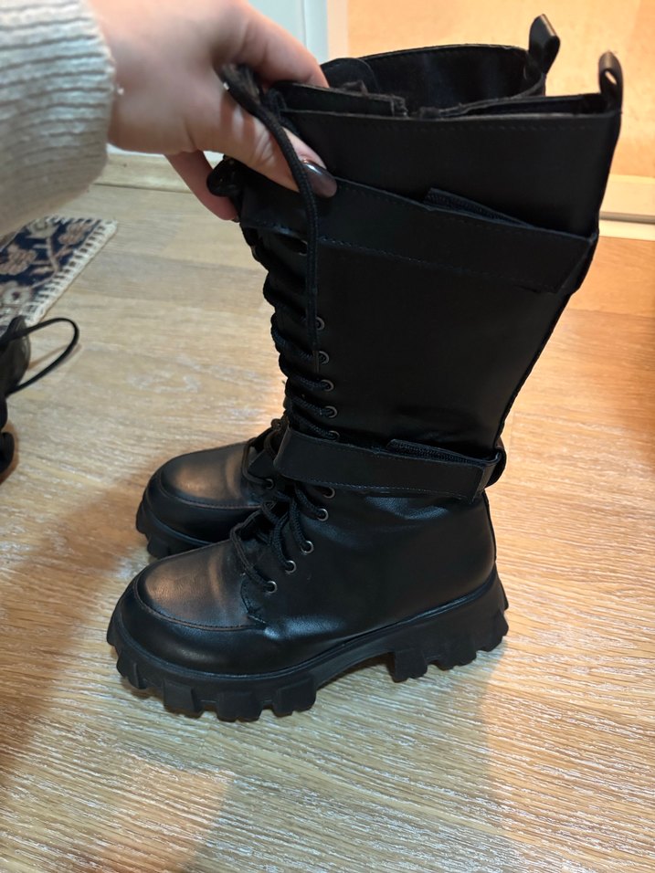 Siyah deri gotik çizme, platform topuklu, tokalı ve bağcıklı detaylarla dikkat çekiyor. Günlük kullanıma uygun.