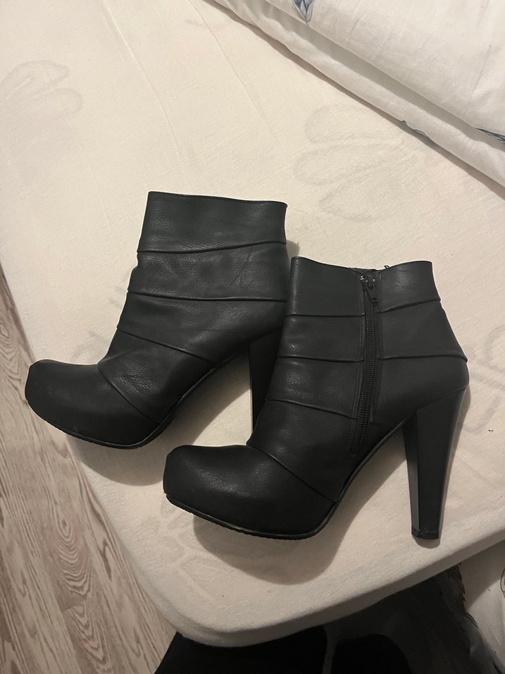Siyah deri platform topuklu kadın botları, tokalı detaylara sahip. Minimalist gotik tarzda, romantik akşamlar için uygun. Desensiz ve koyu renkte.