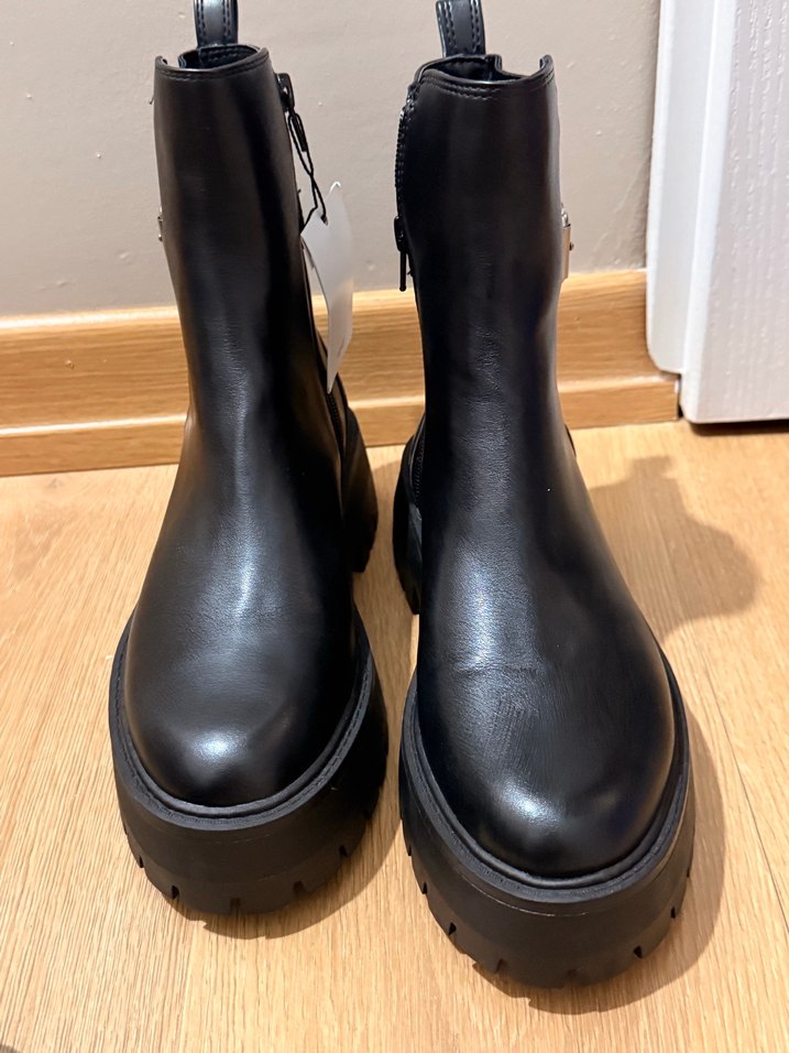 Siyah deri platform topuklu, tokalı kadın botları. Goth tarzını yansıtan, günlük kullanıma uygun trend görünümlü botlar.