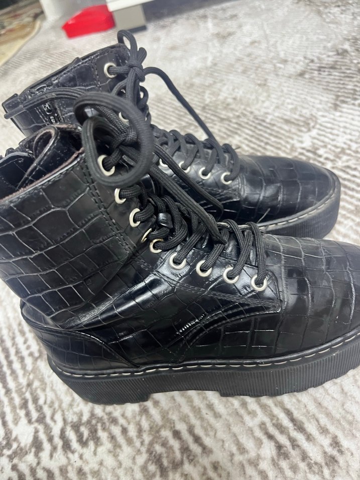 Siyah deri, yılan desenli platform topuklu kadın botu, bağcıklı ve tokalı detaylara sahip, grunge punk tarzı için uygun.