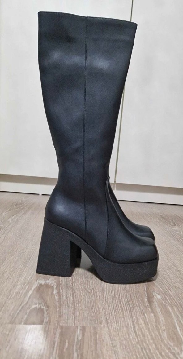 Siyah Deri Platform Topuklu Kadın Çizme