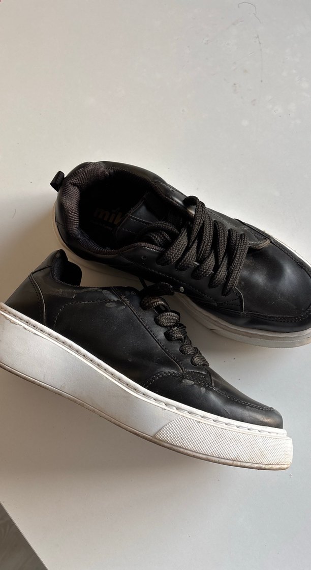 Siyah deri kadın spor ayakkabısı, platform topuklu, desen içermeyen rahat ve şık tasarım, günlük sokak stiline uygun.