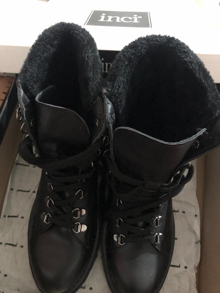 Siyah deri, platform topuklu kadın botları, yumuşak kürk astarlı ve bağcıklı. Rahat ve gotik tarzda, dış mekan kullanımı için uygun. Birkez dahi giyilmedi hala kutusunda