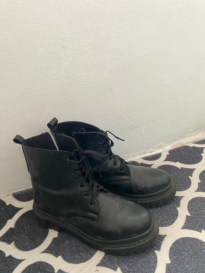 Siyah deri platform topuklu botlar, gotik tarzda ve desensiz. Günlük kullanım için uygun, rock punk havası ve zahmetsiz şıklık sunar.