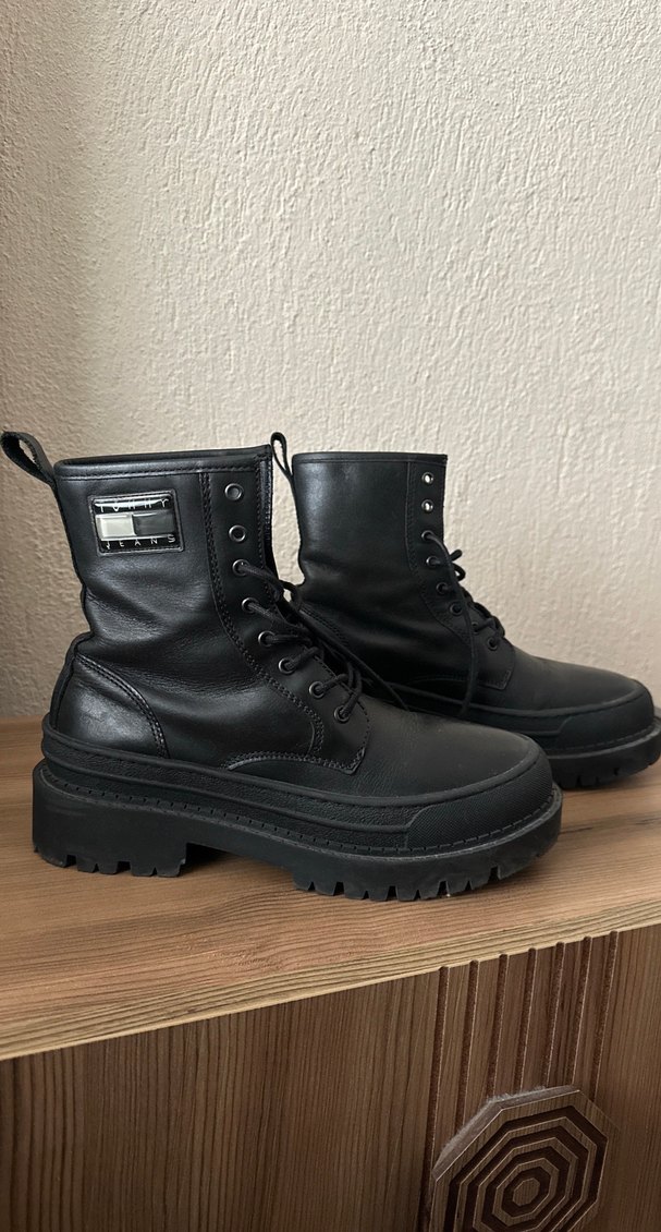 Siyah deri platform topuklu, tokalı botlar. Gotik esintili sokak tarzı ve rock punk havası sunar. Günlük kullanıma uygundur.