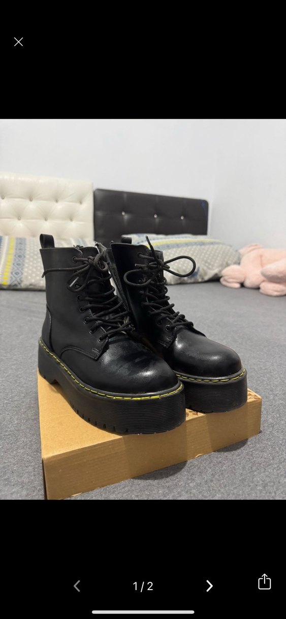 Siyah kauçuk platform topuklu botlar, tokalı ve bağcıklı, grunge punk goth tarzında. Günlük kullanıma uygun, rock punk havası taşıyor.