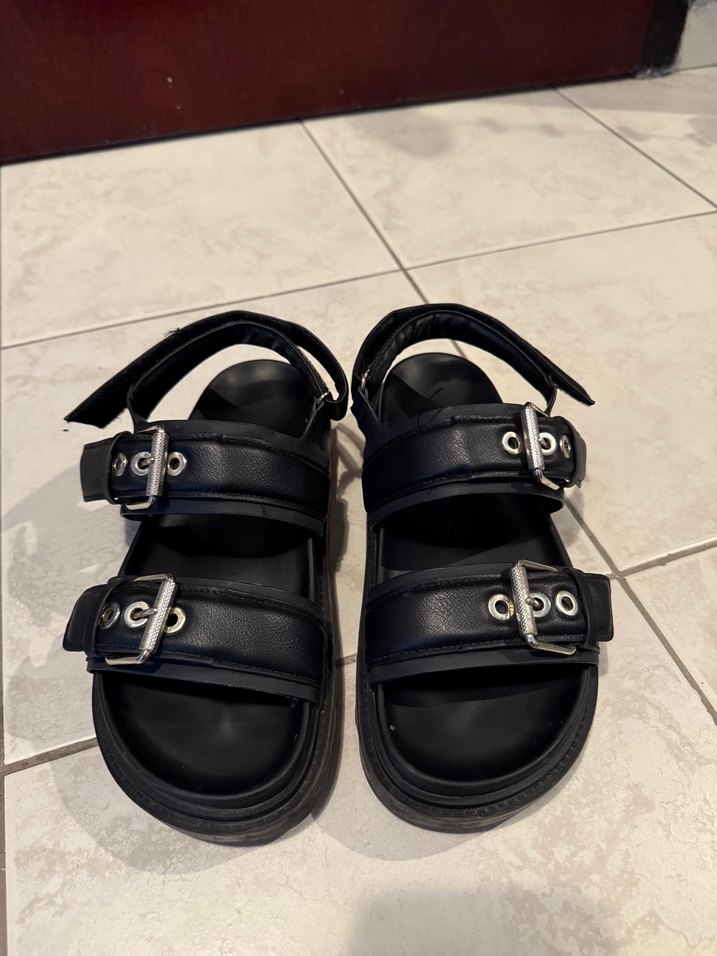 Siyah deri, platform topuklu kadın sandaletler tokalı kayışlara sahiptir. Minimalist goth tarzda, günlük kullanıma uygundur. Rahat ve trend.