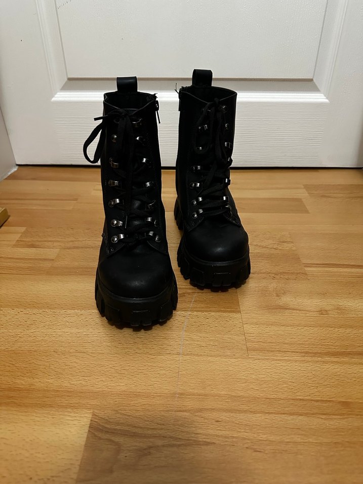 Siyah deri platform topuklu, tokalı botlar. Desensiz, grunge punk tarzıyla uyumlu, günlük kullanım için uygun.