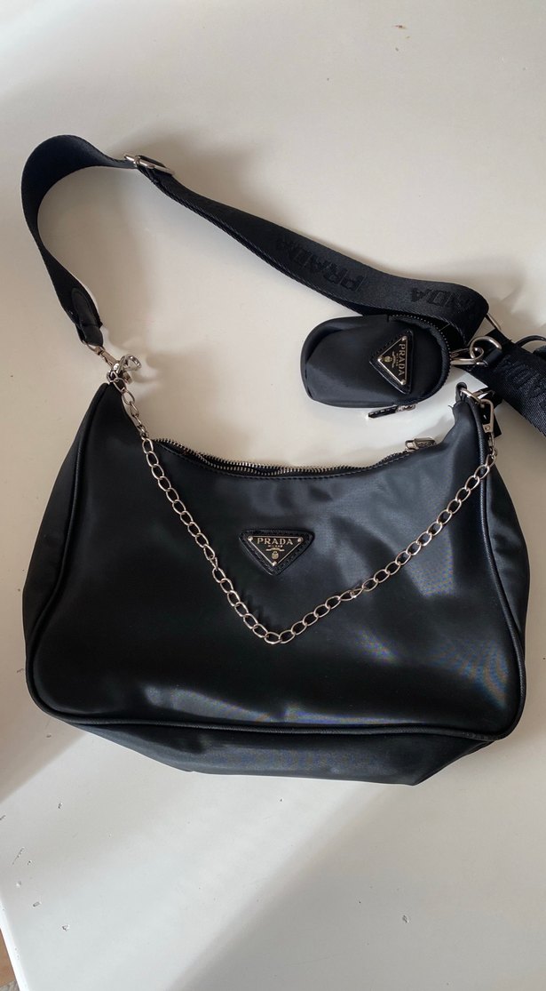 Siyah deri Prada kadın çanta, baskılı detaylar ve fermuarlı bölmeler içerir. Günlük kullanıma uygundur. Çıkarılabilir küçük cüzdan ve markalı askı mevcuttur.