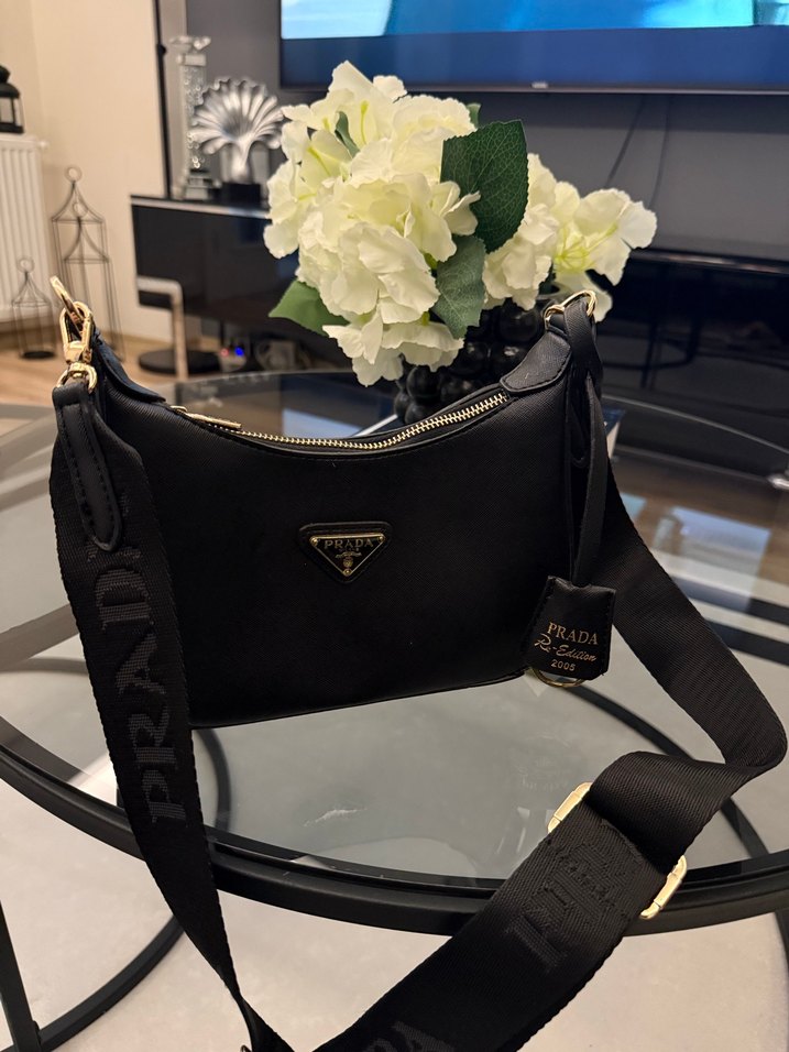 Siyah deri Prada kadın omuz çantası, tokalı askısı ve baskılı detaylarıyla günlük kullanıma uygun klasik Paris tarzını yansıtıyor.