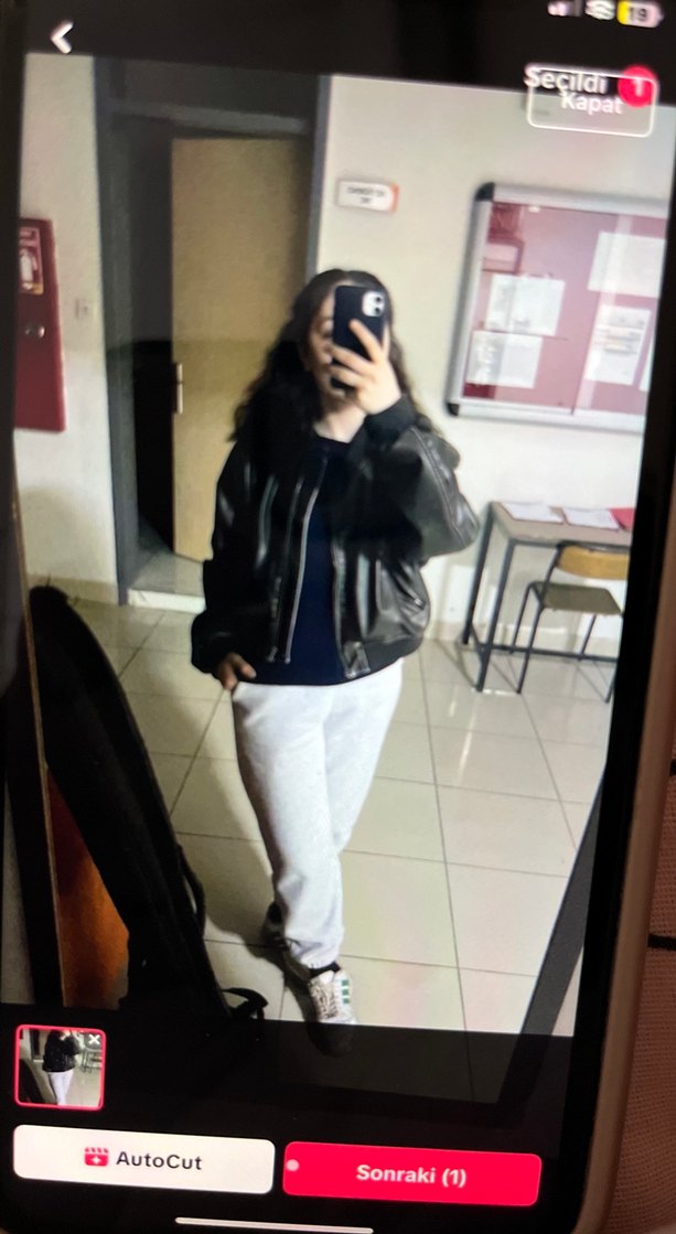 Siyah deri, puff kol ve yüksek yakalı, bol kesim midi boy ceket. Günlük sokak stili için uygun.