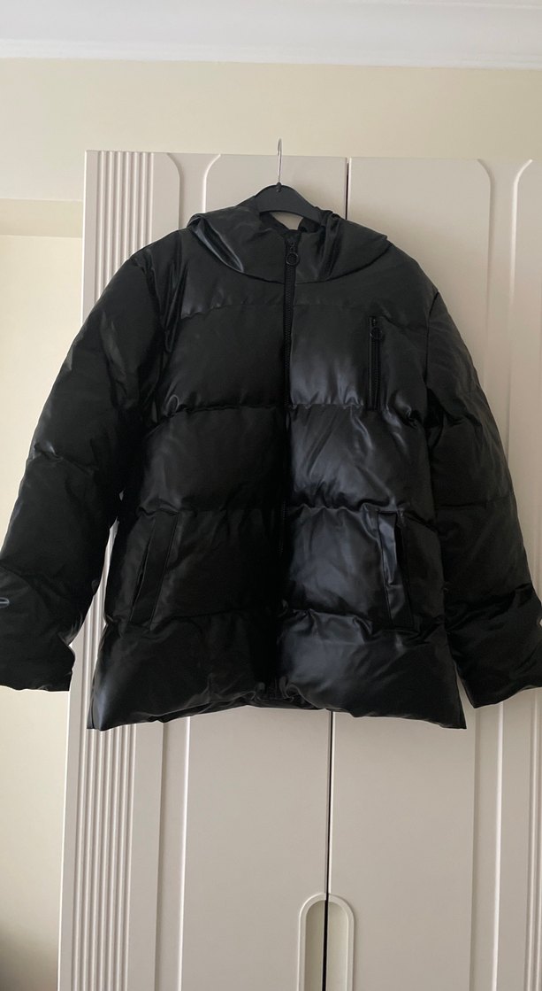 Siyah deri, puff detaylı, kadın kışlık mont. rahat ve şık dış mekan kullanımı için uygun tam astarlıdır ceplidir sıcacık tutar hiç giyilmedi