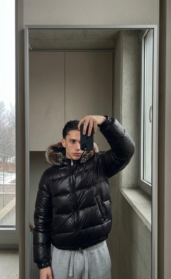 Siyah Deri Puff Mont Yüksek Yaka