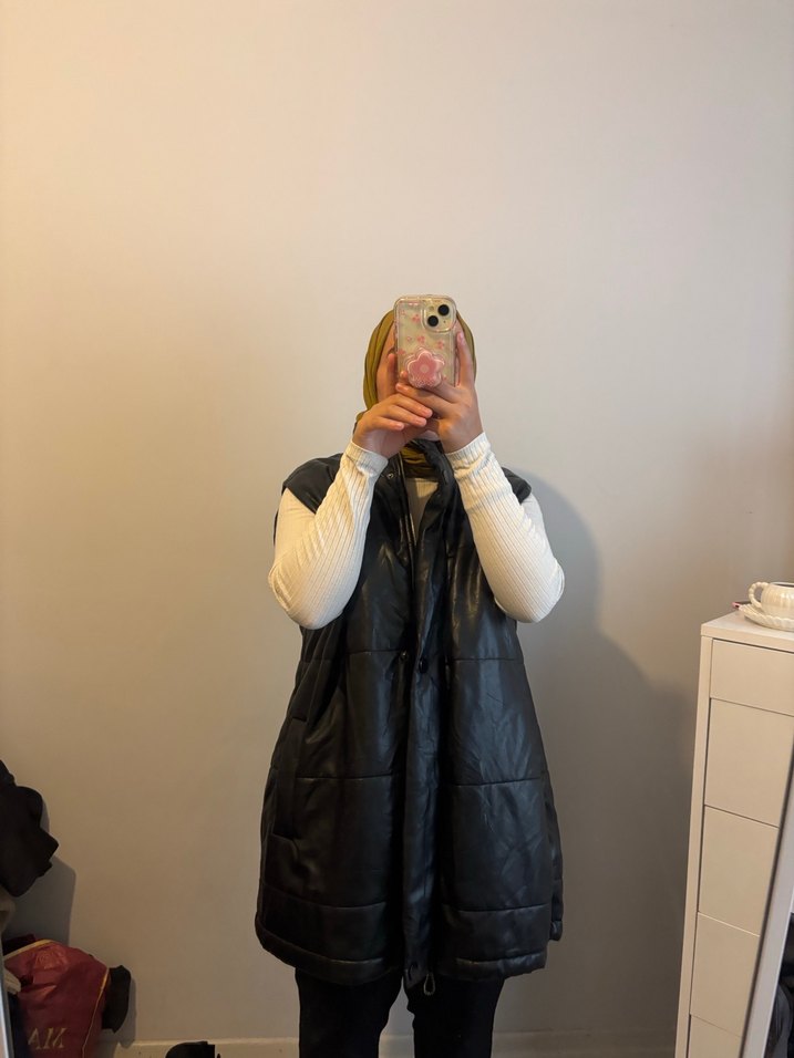 Siyah deri, yüksek yakalı ve puff detaylı kolsuz yelek. Rahat kesim ve midi boy, günlük sokak tarzına uygun. 1 beden