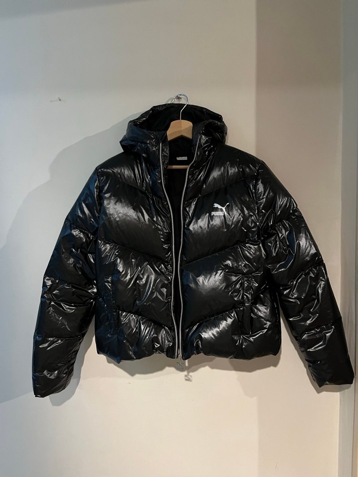 Siyah Deri Puma Kaz Tüyü Kadın Kış Montu