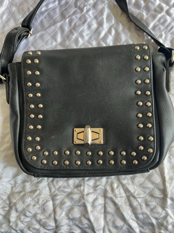 Tokalı kapak ve metal çıtçıt detaylı siyah deri çanta, desenli ve rock punk tarzına uygun. Günlük kullanıma uygundur.