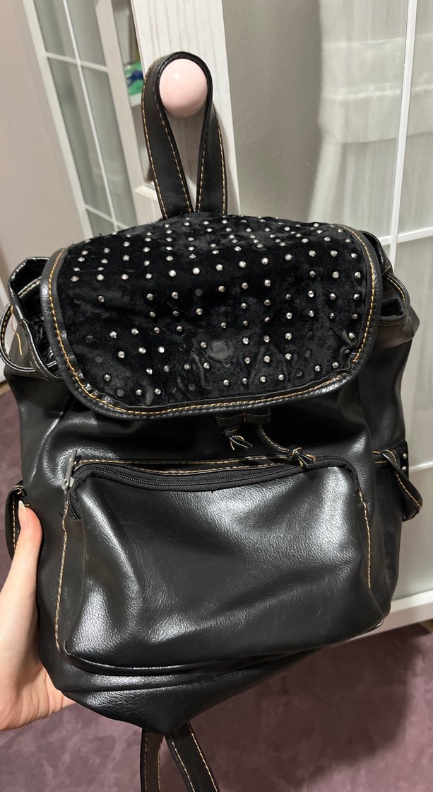 Tokalı kapak ve çivili detaylara sahip siyah deri sırt çantası, günlük kullanım için grunge punk tarzında.