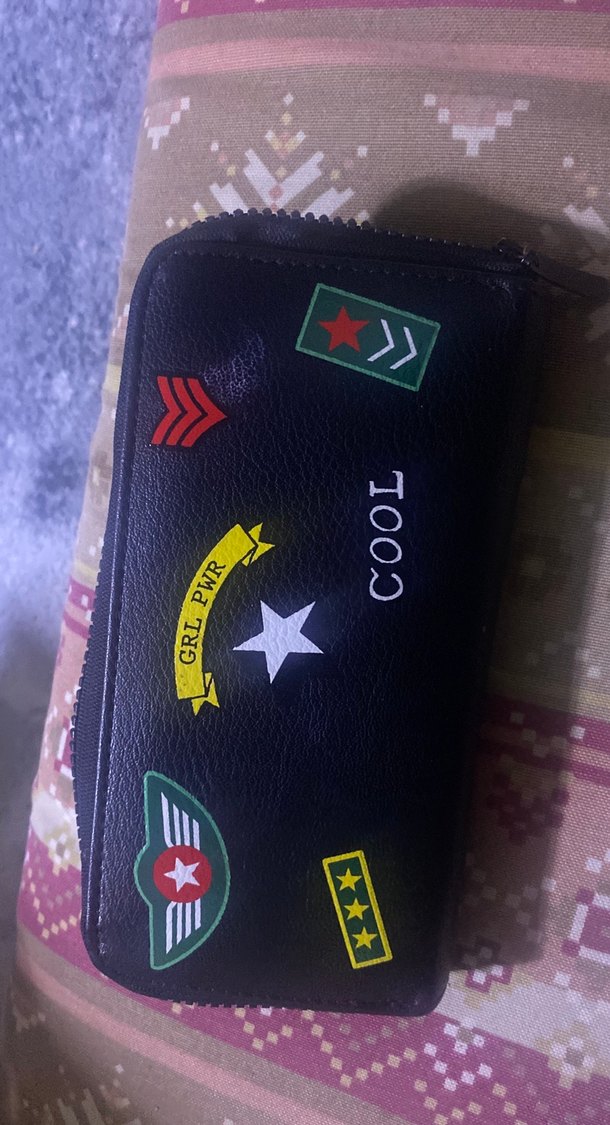 Siyah deri, baskılı yamalarla süslenmiş, cırt cırtlı kapanmalı, rock punk tarzı kadın cüzdanı.