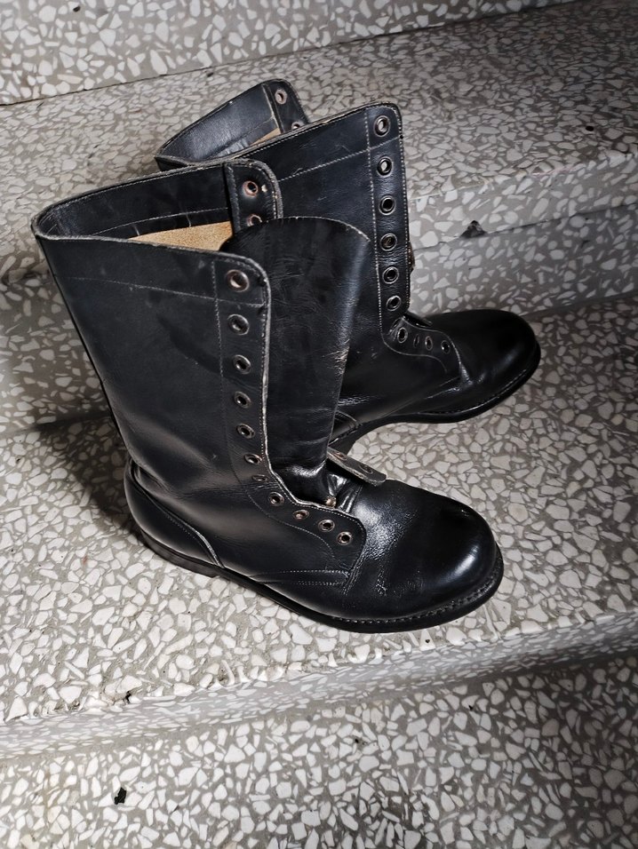 Siyah deri erkek botları, gotik tarzda tokalı detaylara ve koyu kamuflaj desenine sahiptir. Günlük kullanım için uygundur, grunge punk havası taşır.