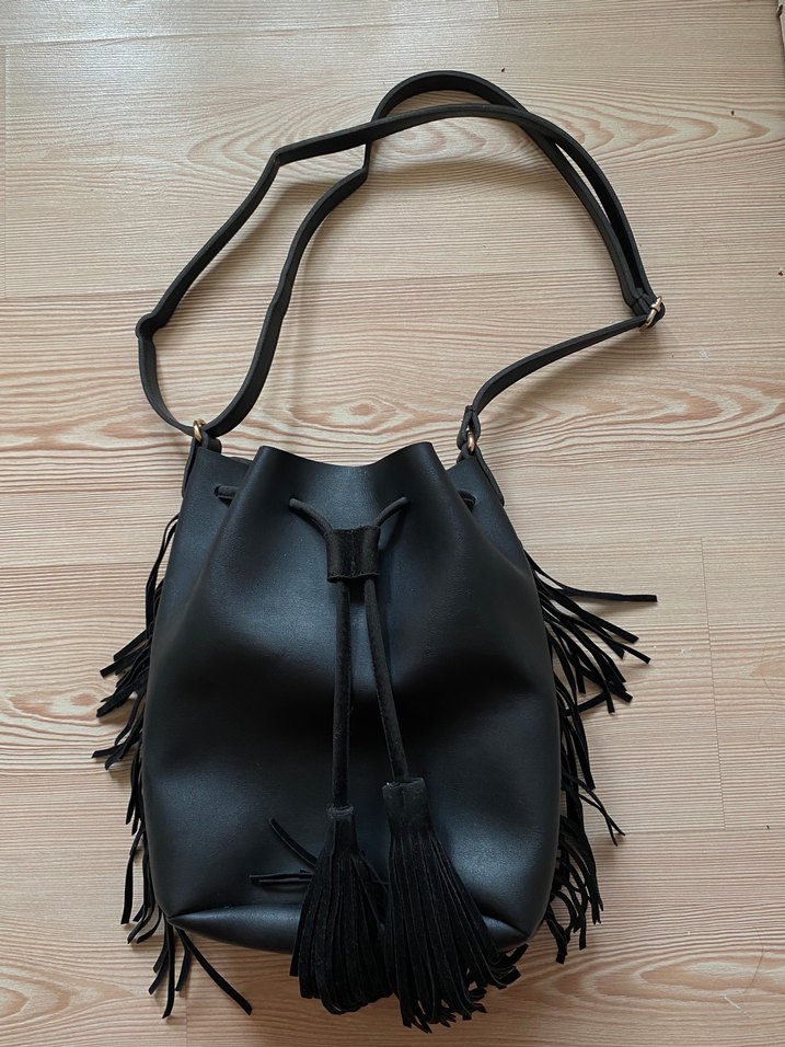 Siyah deri, püsküllü ve bohem tarza sahip kadın çantası. Minimalist tasarımıyla günlük kullanıma uygundur.