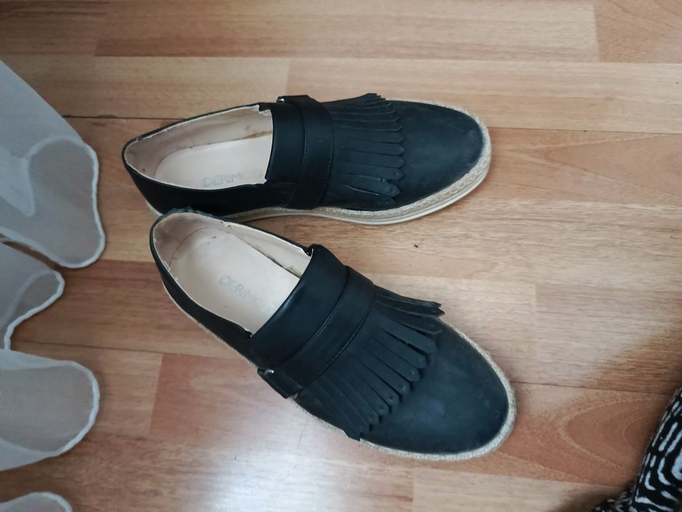 Siyah deri malzemeden yapılmış, püskül detayli espadril. Minimalist normcore tarzıyla günlük kullanıma uygun.