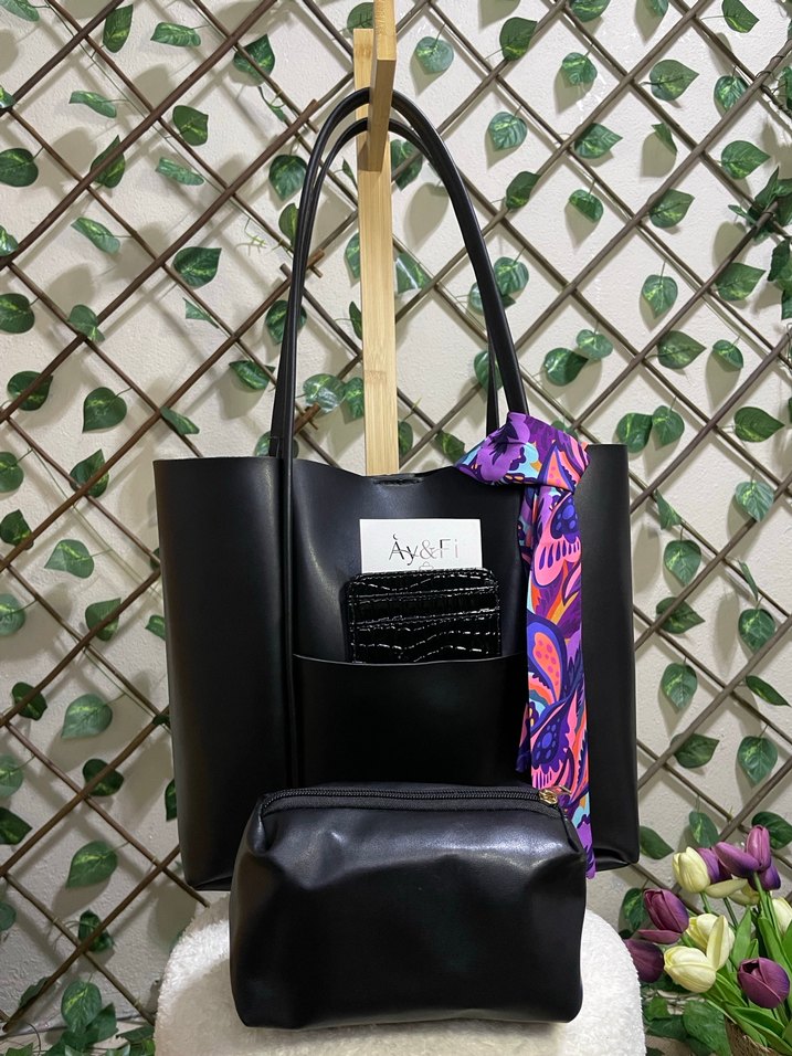 Siyah deri püsküllü çanta, renkli desenli fular detayı ile günlük kullanım için uygun. Küçük cüzdan ve dış cepleri 'Ay&Fi' yazılıdır.