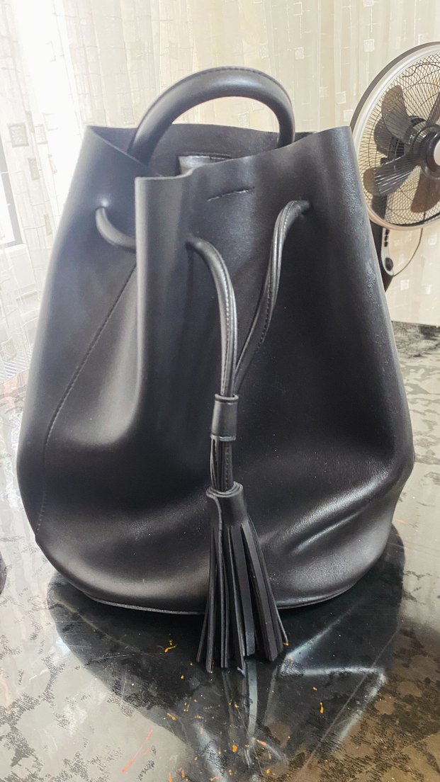 Siyah deri püsküllü kadın çanta, minimalist ve gotik tarzda, günlük kullanıma uygun.