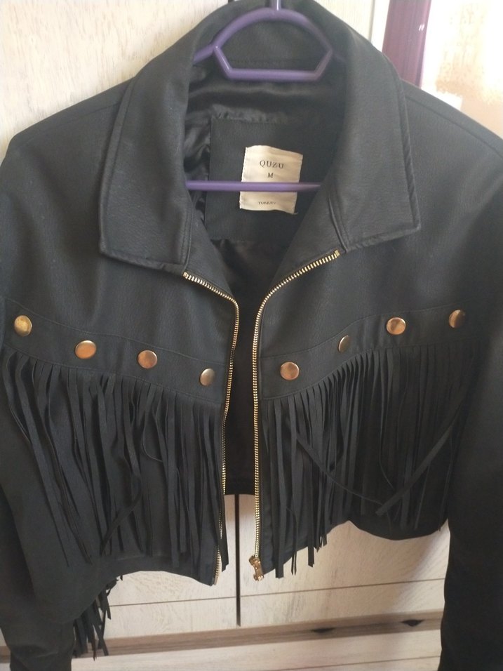 Siyah deri mini ceket, püskül ve düğme detaylarıyla, keskin yaka ve dar kesimiyle trend sokak tarzı sunar.