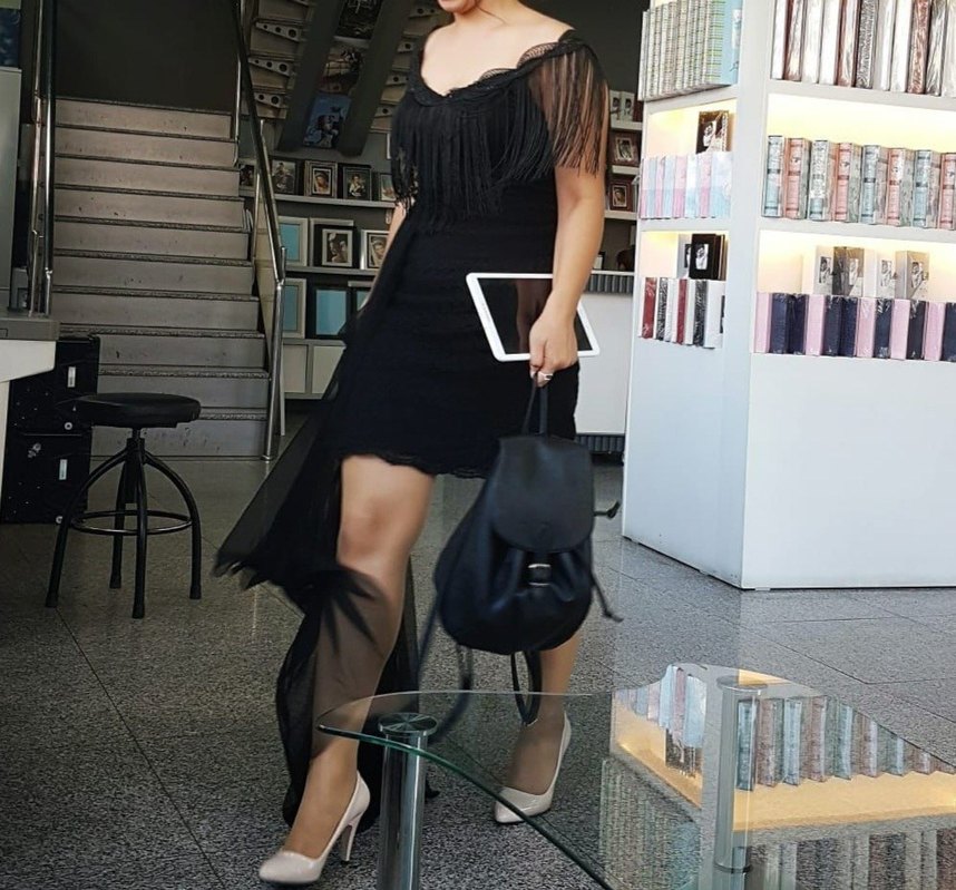 Siyah deri mini elbise, straplez yaka ve püskül detaylarıyla gotik ve iş stilini birleştirir. Ofis için şık ve trend bir tercih.
