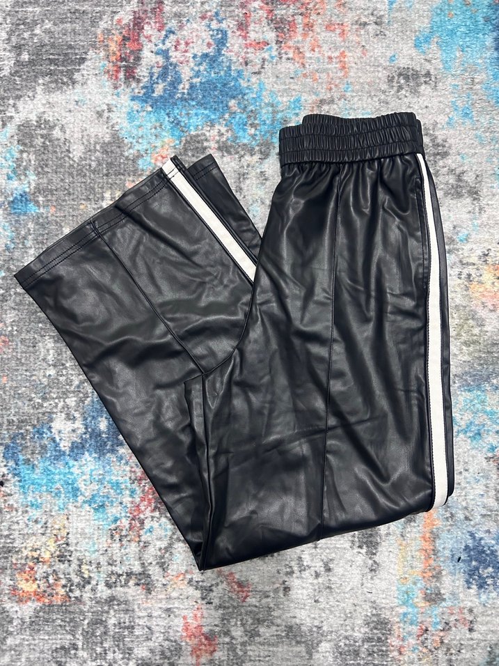 Siyah deri, kemerli ve yan şerit detaylı, rahat kesim kadın pantolonu. Sokak stili ve dış mekan kullanımı için uygundur. Yanlardan ceplidir. Tertemiz ve sorunsuzdur.